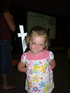 Caroline went to VBS at my dad's church this year...and she had a blast! I'm so glad she was able to go, since you have to be 4 at our church. The first night they stuffed toy turtles for children whose belongings have been distroyed by natural disaster and our conversation about it went like this: